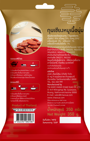 Chaosua Chinese Sausage - Tender & Soft Cooking Instruction : Bring Chinese Sausage to boil for 2 minutes. Drain. Deep fried with medium heat or grill till Chinese sausage is golden brown. Storage : Unopened pack- Store in ambient temerature. After open, store in refrigerator at 2-6 degree ° Recommend to consume within 30 days after pack has open. Product is certified by GMP