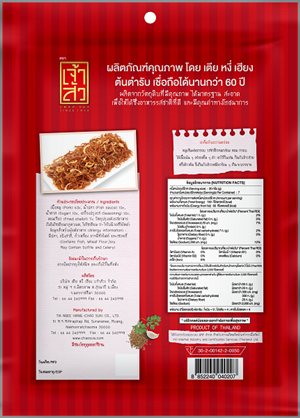 Chaosua Roasted Pork Chaosua productst has been trusted for more than 60 years for their quality ingredients, high standard, delicious taste and nutrition. Warming instruction for tastier roast pork: Microwave with medium heat for 40 seconds for its crispiness and nice aroma. Food allergy information: Contain soy, flour, wheat, celery Storage : Closely seal after open. Store in dry condition.