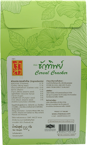 Chaosua Thanyathip Cereal Bar Cereal creacker baked with nuts and grains for healty gap-filling snack anywhere & anytime. Certified by GMP and HACCP Food allergy information : Contain flour & gluten,milk, soy ,sesame, cashew, almond Storage instruction : contain in dry and cool place. Avoid sunlight.
