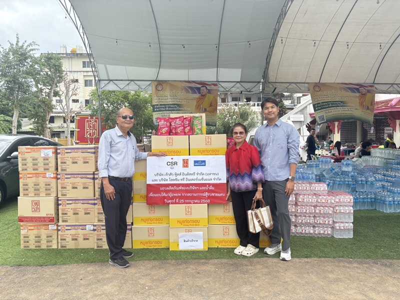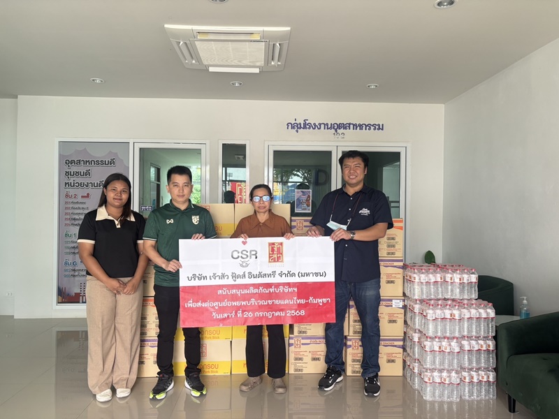 เมื่อวันที่ 25-26 กรกฎาคม 2568 คุณธนภัทร โมรินทร์ ประธานคณะกรรมการบริหาร คุณวรปราณี โมรินทร์ รองประธานคณะกรรมการบริหาร และคุณวรัชย์ โมรินทร์ ผู้จัดการฝ่ายวิศวกรรมและปฏิบัติการโครงการ ในนามตัวแทน บริษัท เจ้าสัว ฟู้ดส์ อินดัสทรี จำกัด (มหาชน) และ บริษัท โฮลซัม ทรี อินเตอร์เนชั่นแนล จำกัด ได้มอบ ผลิตภัณฑ์บริษัทฯ และน้ำดื่มตราเจ้าสัว แก่วัดแจ้งให้ และสำนักงานอุตสาหกรรมจังหวัดนนครราชสีมา เพื่อส่งต่อให้ผู้อพยพพื้นที่ชายแดนจังหวัดศรีสะเกษและจังหวัดอุบลราชธานี จากสถานการณ์ความไม่สงบตามแนวชายแดน โดยมุ่งหวังบรรเทาความเดือดร้อนและสนับสนุนการดำเนินชีวิตของผู้ที่ได้รับผลกระทบจากสถานการณ์ดังกล่าว