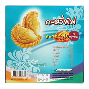 กระหรี่พัฟไส้ไก่ กรอบ อร่อย ไส้เยอะ ส่วนประกอบโดยประมาณ แป้งสาลี 40% เนื้อไก่ 20% น้ำมันพืช 15% น้ำตาลทราย 15% มันเทศ 5% ผงกระหรี่ 3% เกลือ 1 % พริกไทย 1 % ****มีแป้งสาลี เป็นส่วนประกอบ ผู้แพ้แป้งสาลีควรหลีกเลี่ยง****