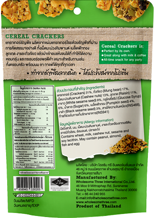 โฮลซัม แครกเกอร์ธัญพืช แครกเกอร์อบกรอบโรยธัญพืชหลากหลายชนิด อิ่มได้ทุกที่ทุกเวลา และทุกโอกาส ได้รับการรับรองระบบ GMP HACCP สากลสำหรับกระบวนการผลิตธัญทิพย์ จากบริษัท SGS (Thailand) Ltd ข้อมูลสำหรับผู้แพ้อาหาร:มีแป้งสาลี,นม,ถั่วเหลืองจากเลซิติน,งาและเม็ดมะม่วงหิมพานต์ อาจมีถั่วลิสง,อัลมอลด์,ปลาและไข่ ข้อแนะนำในการเก็บรักษา : ควรเก็บในที่แห้งและเย็น หลีกเลี่ยงแสงแดด